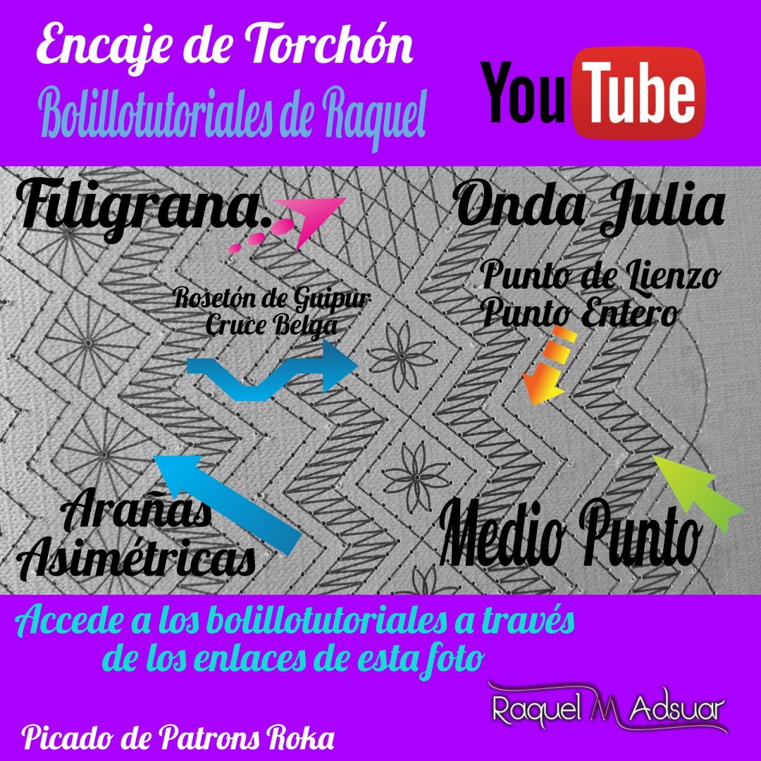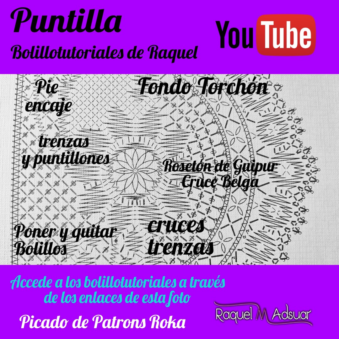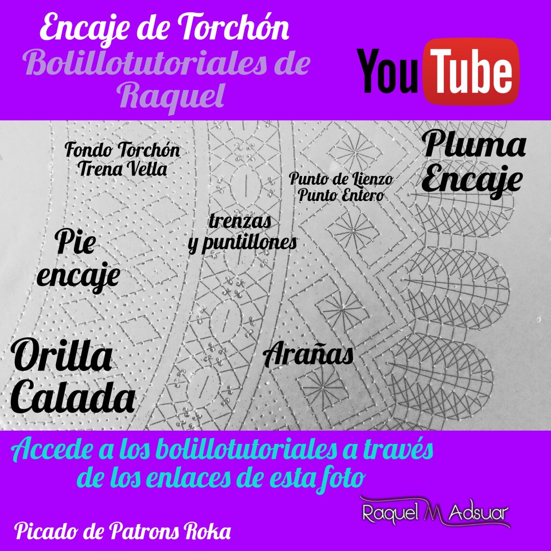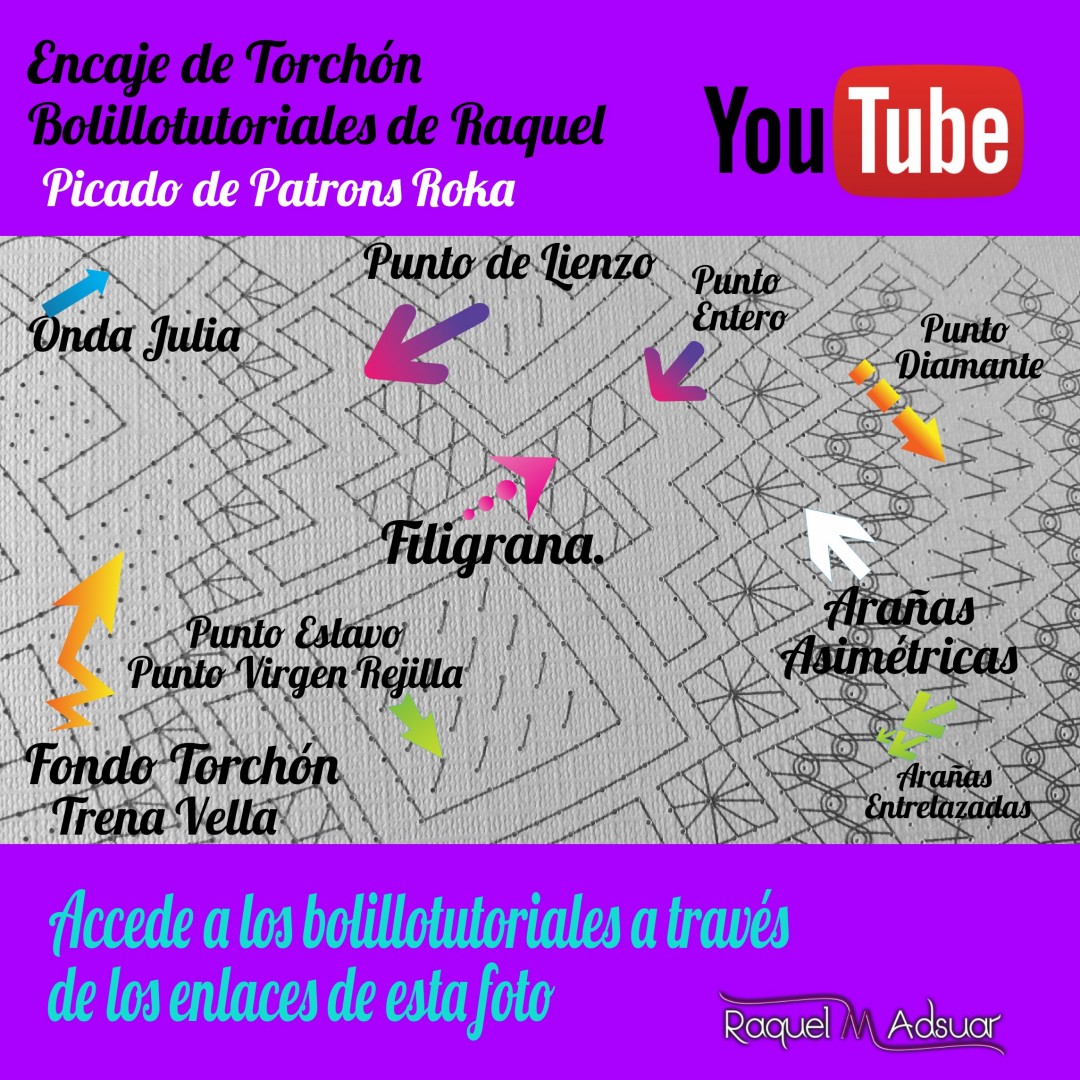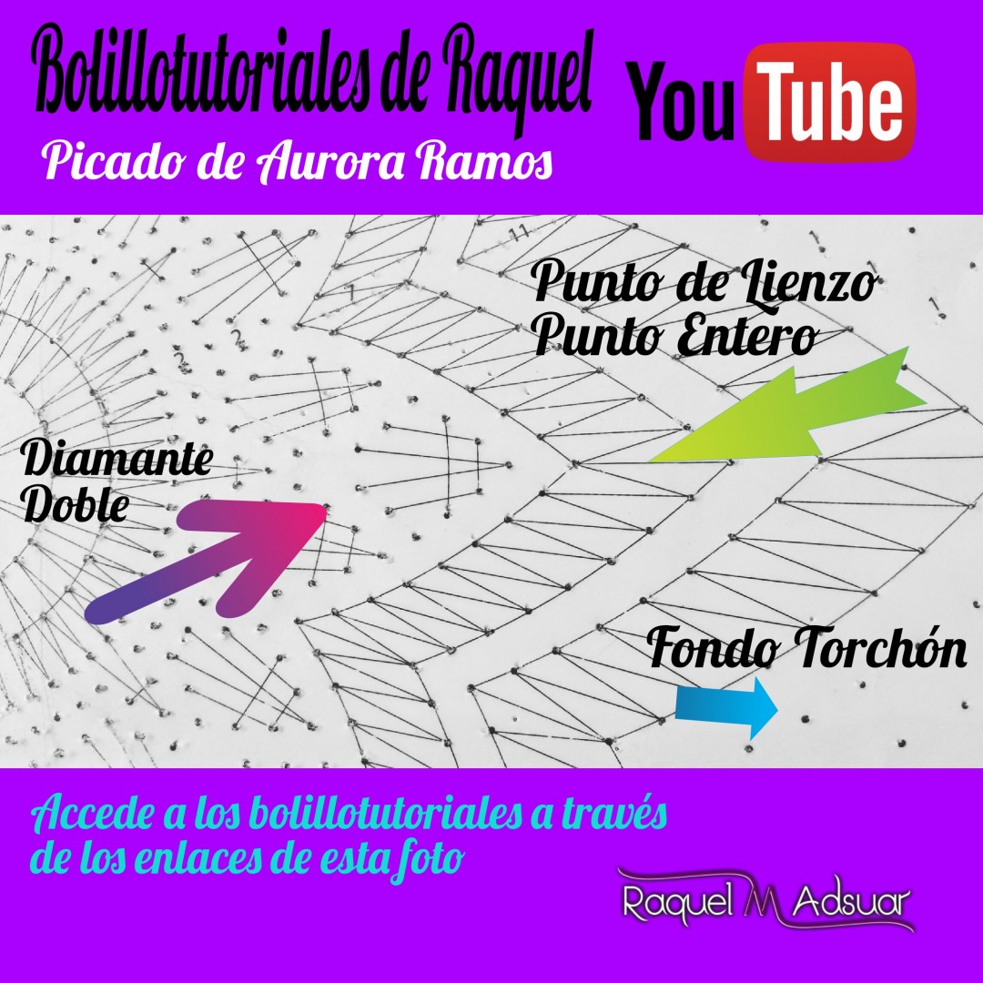 Para ayudaros con este tema, os he preparado una galería de imágenes con diferentes picados. Cada uno corresponde a una técnica de encaje de bolillos determinada. En cada foto tenéis el nombre del punto. Entrando en Youtube y poniendo el nombre de dicho punto + «Raquel», tendréis el acceso directo al bolillotutorial.