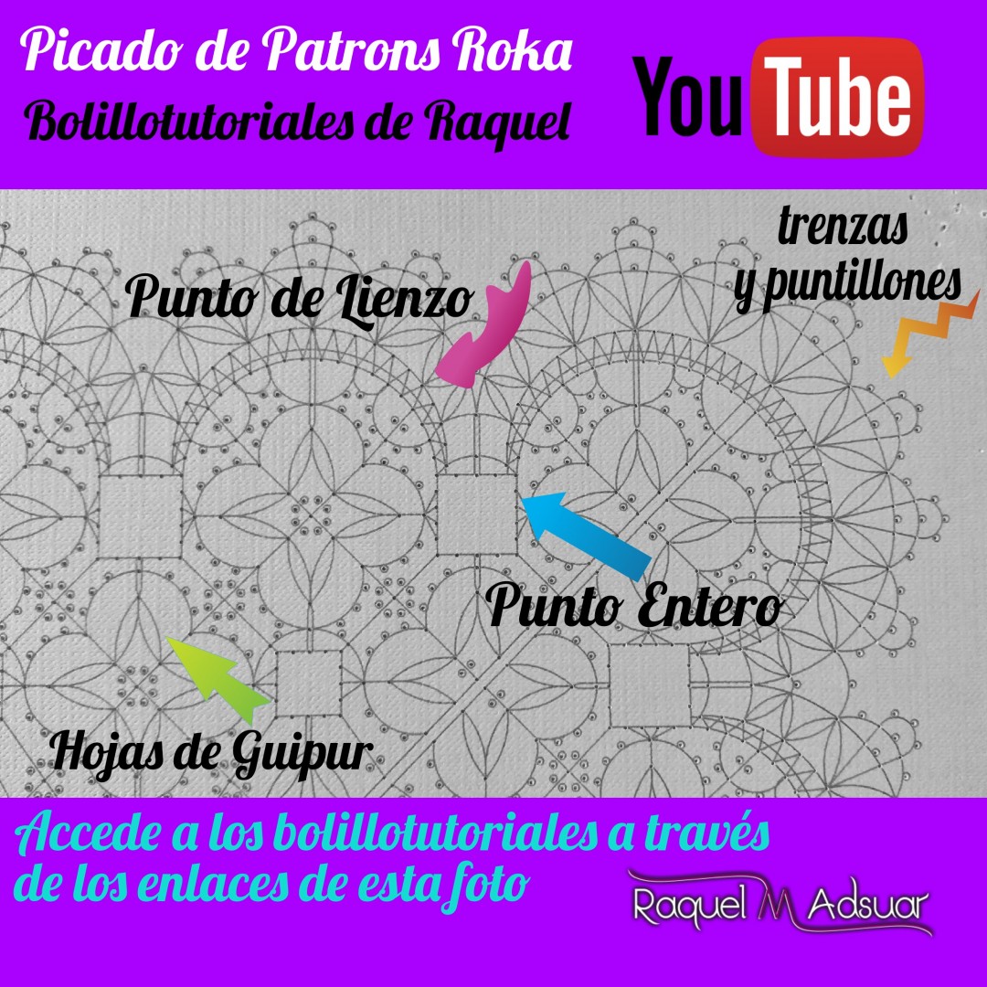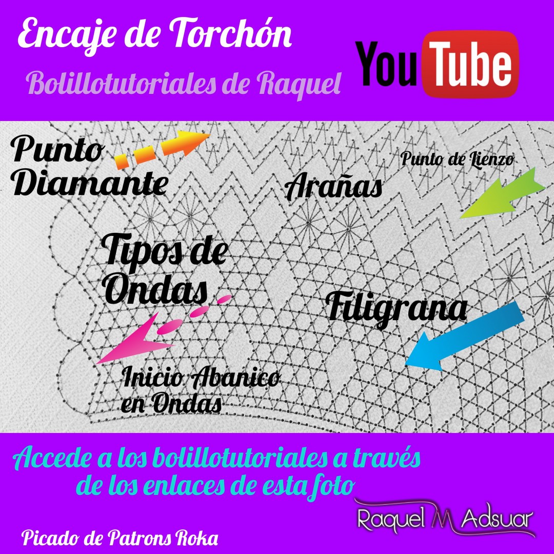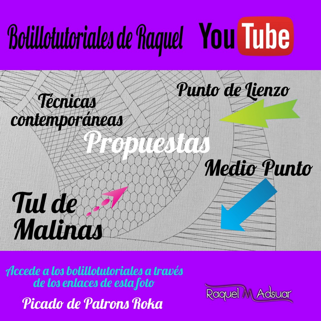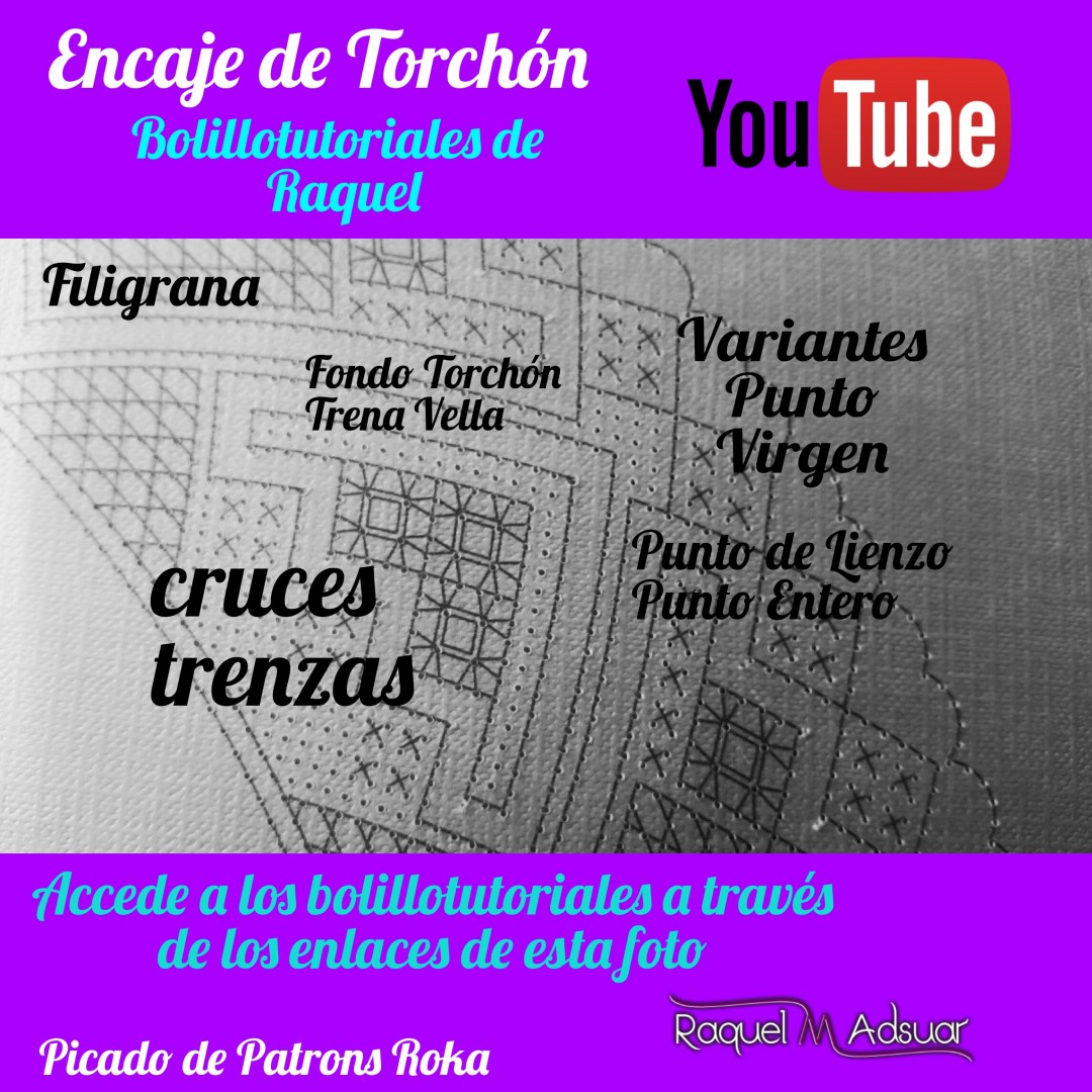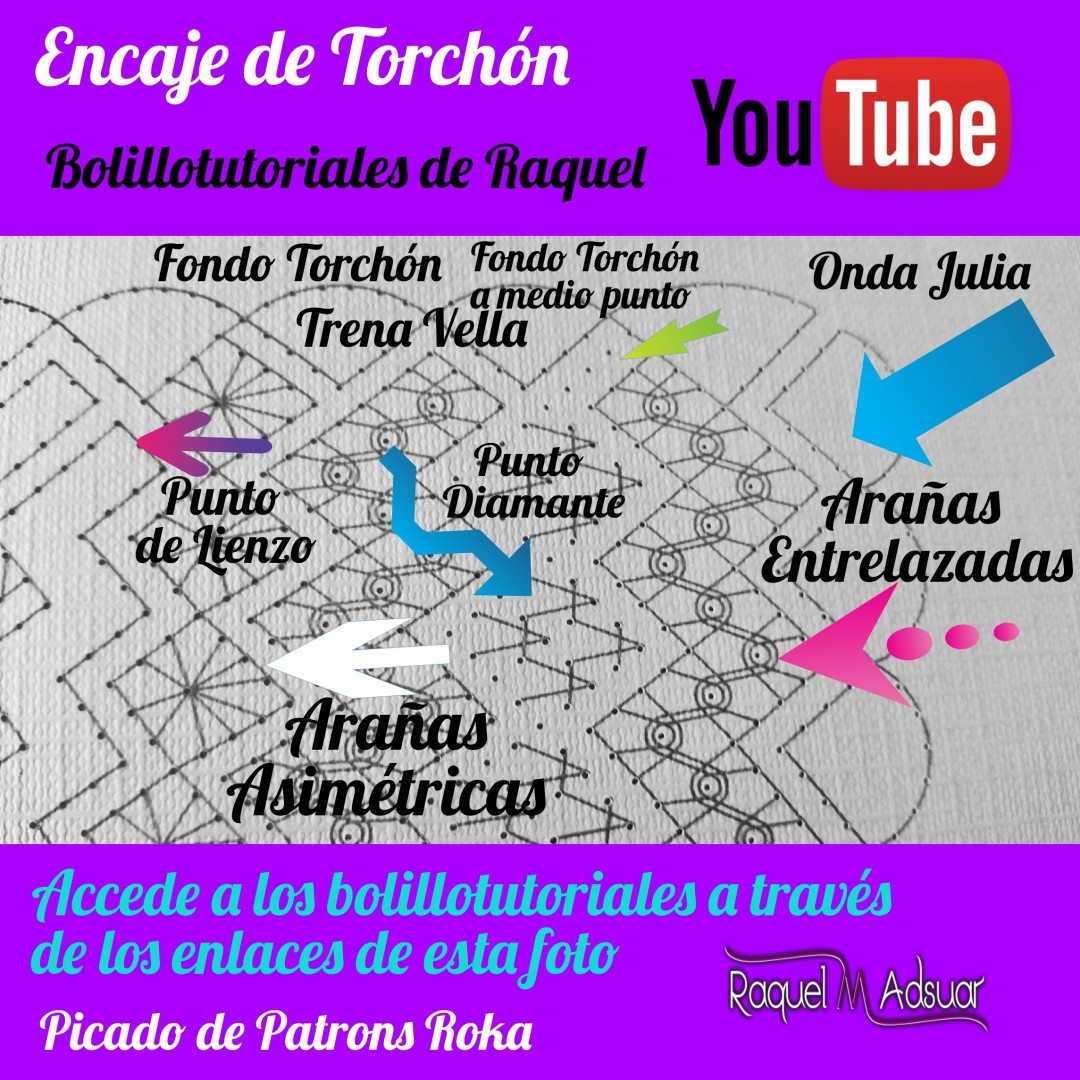 Para ayudaros con este tema, os he preparado una galería de imágenes con diferentes picados. Cada uno corresponde a una técnica de encaje de bolillos determinada. En cada foto tenéis el nombre del punto. Entrando en Youtube y poniendo el nombre de dicho punto + «Raquel», tendréis el acceso directo al bolillotutorial.