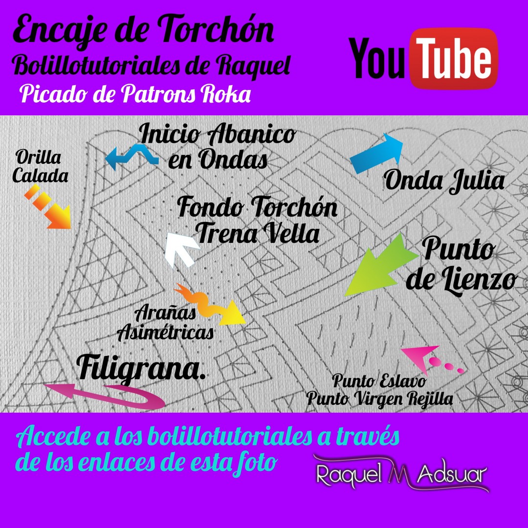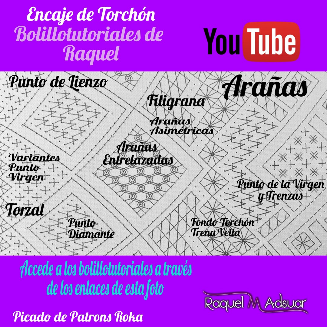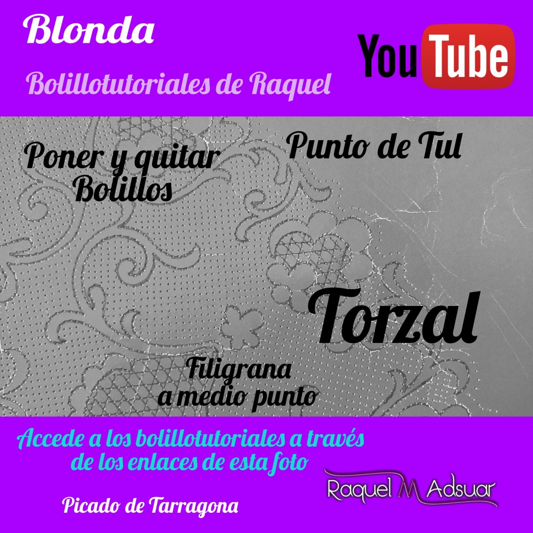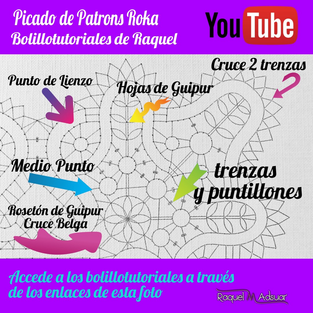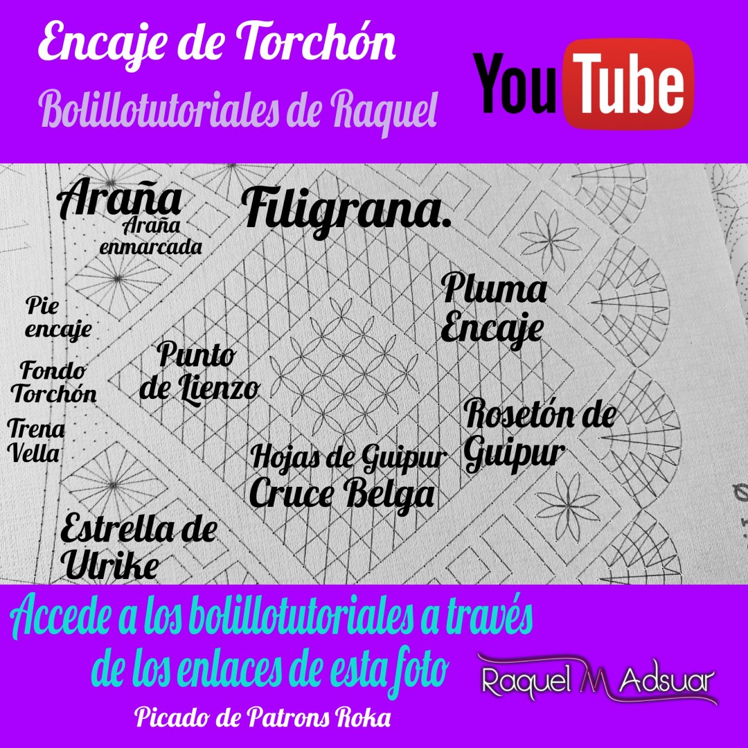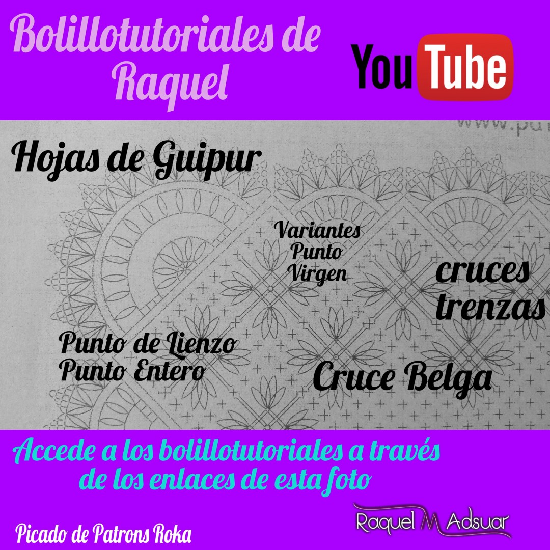 Para ayudaros con este tema, os he preparado una galería de imágenes con diferentes picados. Cada uno corresponde a una técnica de encaje de bolillos determinada. En cada foto tenéis el nombre del punto. Entrando en Youtube y poniendo el nombre de dicho punto + «Raquel», tendréis el acceso directo al bolillotutorial.