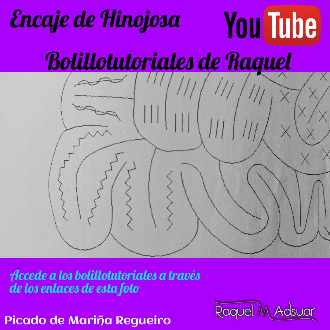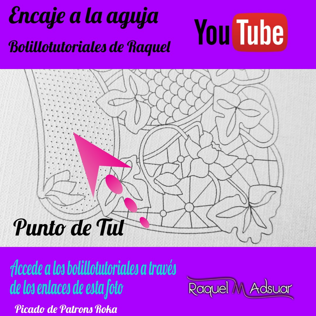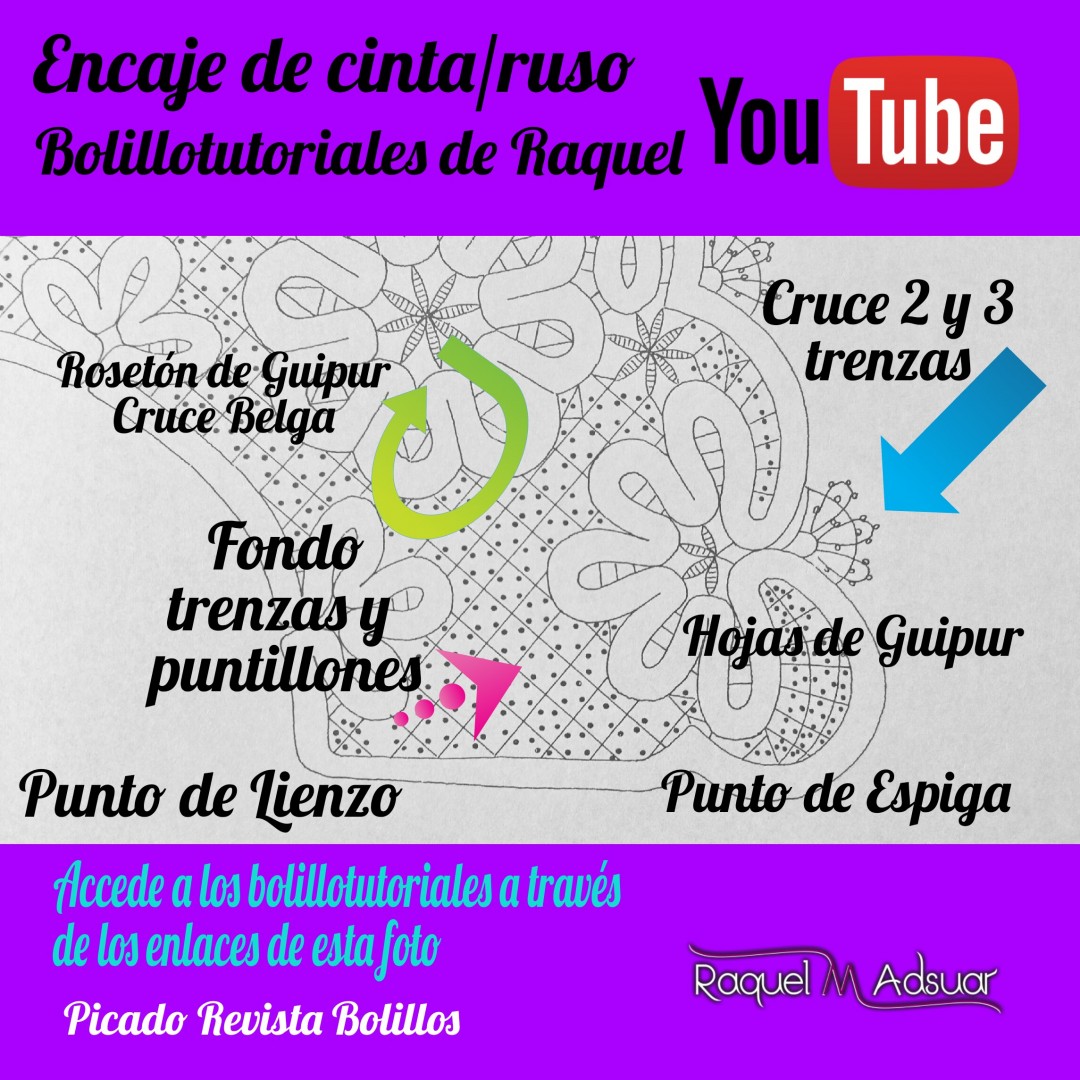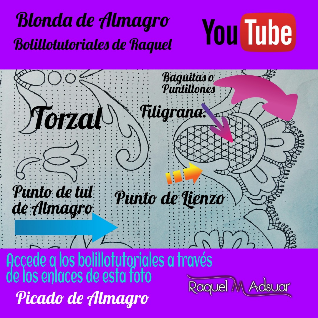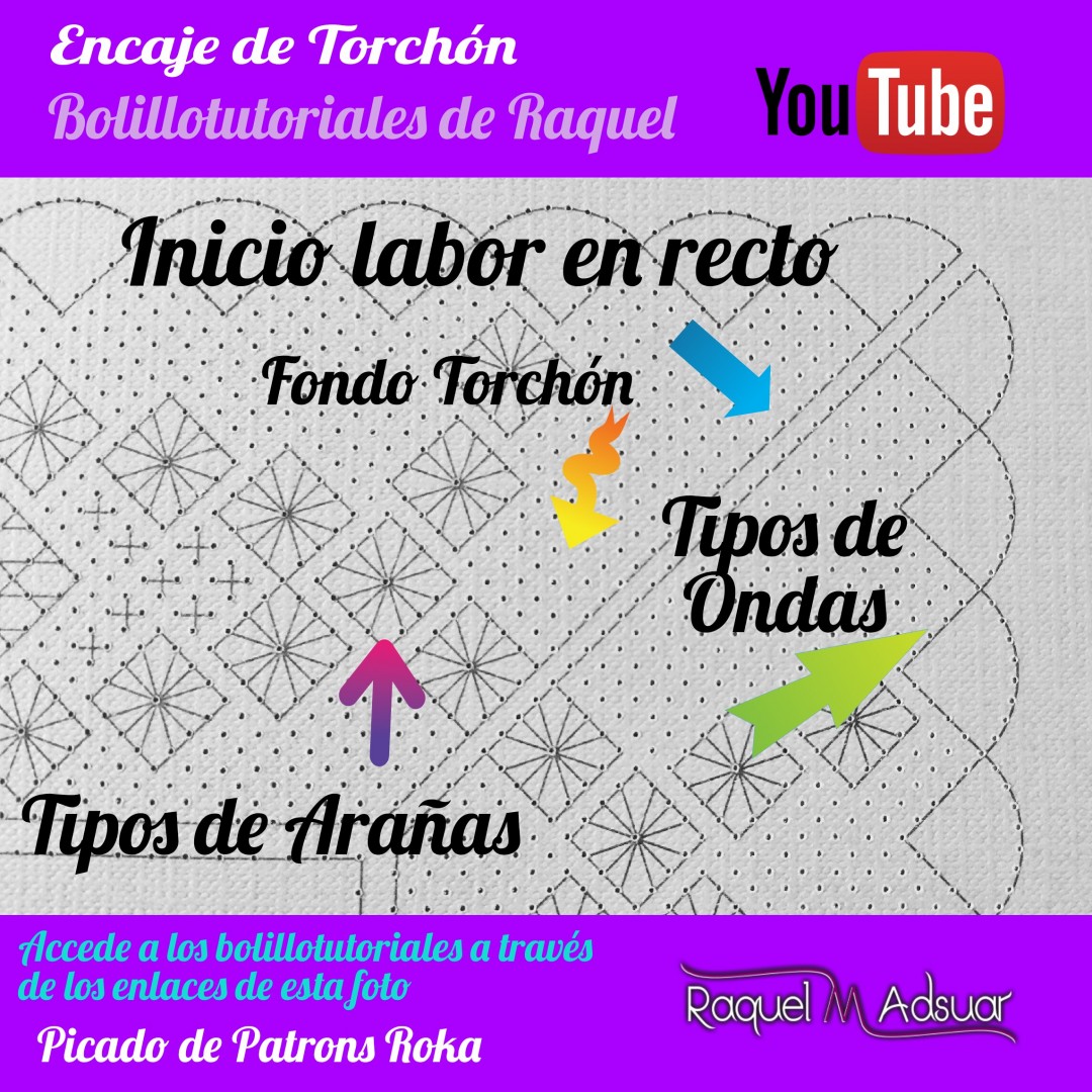 Para ayudaros con este tema, os he preparado una galería de imágenes con diferentes picados. Cada uno corresponde a una técnica de encaje de bolillos determinada. En cada foto tenéis el nombre del punto. Entrando en Youtube y poniendo el nombre de dicho punto + «Raquel», tendréis el acceso directo al bolillotutorial.